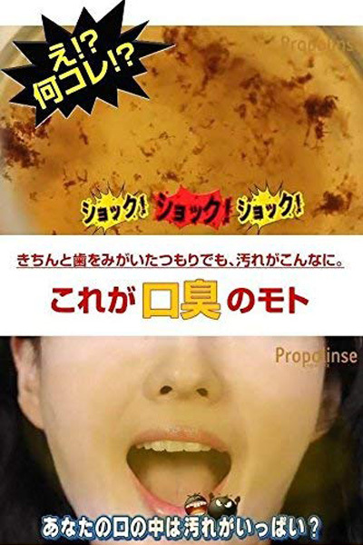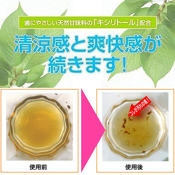 <成分>水、グリセリン(湿潤剤)、エタノール(溶剤)、PEG−60水添ヒマシ油(可溶化剤)、チャ葉エキス・プロポリスエキス・キシリトール・メントール・サッカリンNa(香味剤)、クエン酸・クエン酸Na・リンゴ酸(pH調整剤)、カラメル(着色剤)、メチルパラベン(保存剤)、香料