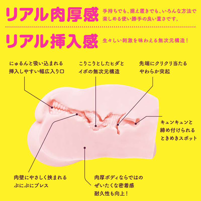 ツルツルのアソコに形の良いヒップ!ふんわり素材と凝った膣内造形を共に味わうオナホール。ねっとりと吸い付き、使うほどペニスに馴染む薄いピンクの素材を採用!超肉厚、置きオナもできてハンディにもなるトルソー型オナホールです。股を開いた時の見た目にソックリで、お尻にまで続く割れ目がエロすぎ。裏返しは破損の原因となるので、長く使うためにもやめておきましょう。お掃除棒1本付き。