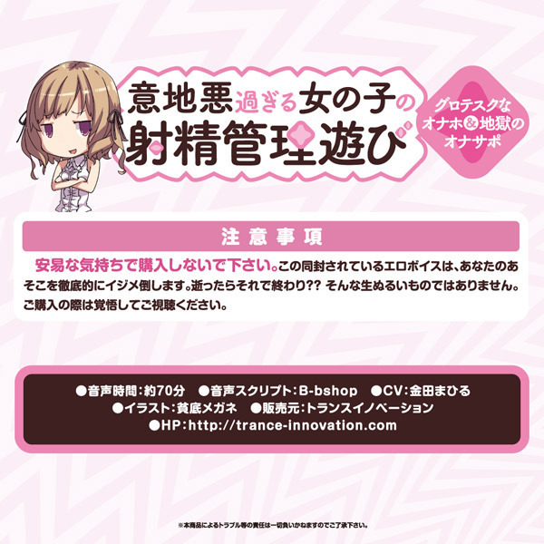 【安易な気持ちで購入しないで下さい】挑戦者求む!残酷な子に搾り取られる危ない快楽を楽しめるCD付きオナホール「意地悪過ぎる女の子の射精管理遊び」。本作は数々のM男達をギブアップさせてきた、あのB-bshop氏が執筆!何でこんなオナホ買ったの?せっかく買ってくださった購入者様を蔑み罵倒する、そんな一風変わった内容のオナホ、音声共にこだわり抜いたドM専用の作品。オナホールの外観は生理的に受け付けないキモさ!内部は二色の二層式でキモさ倍増なイボヒダ構造です。同封されているCDはあなたのアソコを徹底的にイジメ倒しますので覚悟してご視聴ください。●音声時間約70分●音声スクリプト:B-bshop●CV:金田まひる●イラスト:貧底メガネ。※オナホール単品(v01446)、CD単品(v01447)はこちら!