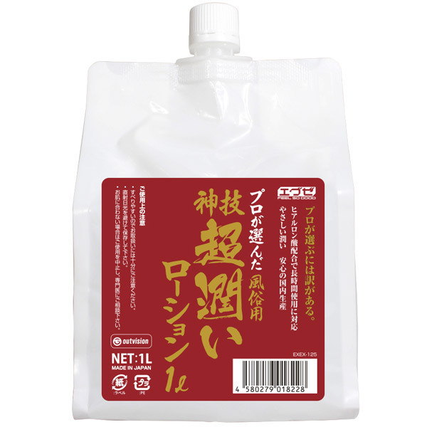 プロが選ぶには訳がある!風俗用・神技超潤いローションは風俗店に最適な大容量1Lパウチ入りの業務用1リットルサイズ。現場での長時間使用を想定した超潤い&超お得な風俗店用ローション!ヒアルロン酸を配合したやさしい潤いで長時間のプレイにも対応。そのままでも詰め替え用としてもご使用いただけます。安心の国内生産です。