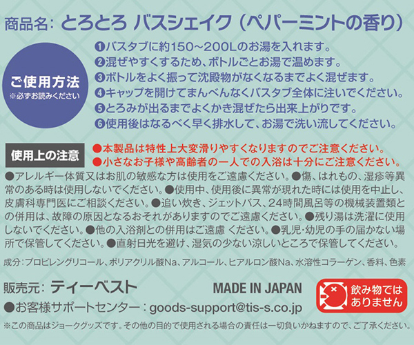 爽やかな香りが暑い時期に最適!美容成分配合のペパーミント香る入浴剤(日本製)。お湯に混ぜるだけで手軽にローション風呂ができる!溶けやすく落としやすい製法で仕上げているため使用後のお手入れ楽々♪1人でもカップルでも楽しめる夢心地のバスタイムを是非どうぞ!使い切りタイプ