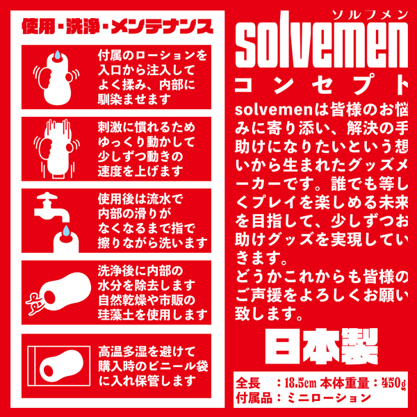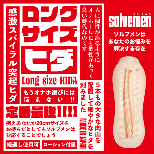様々な人の悩みをなんとか解決したいというコンセプトをもとに生まれた「ソルブメン」より、すっぽり包み5つの縦ヒダで弾くように刺激する♪全長18.5cm、重さ450gのビッグな日本製の非貫通オナホが登場。ヒダ突起に螺旋に渦巻くスパイラル構造をプラス、快感を後押しする内部に設計!ほかにもショートサイズもご用意しております。繰り返し使用可能