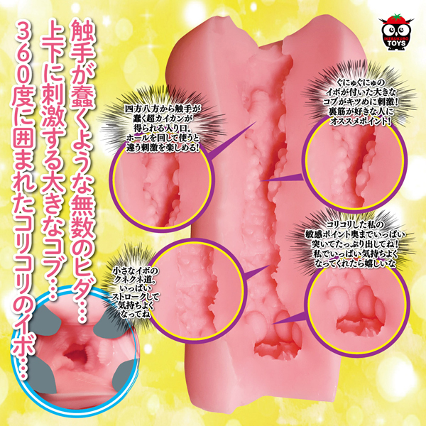 無数の蠢くヒダが無限に絡みつく触手系オナホ。四方八方から迫りくる触手や裏スジ刺激のコブゾーン、360度配置されたコリコリ触感のイボ達が非日常的な快感を与える!ボディには程よい弾力でもち肌の日本製エラストマー素材を採用♪嫌なニオイも軽減した350gの肉厚オナホです。