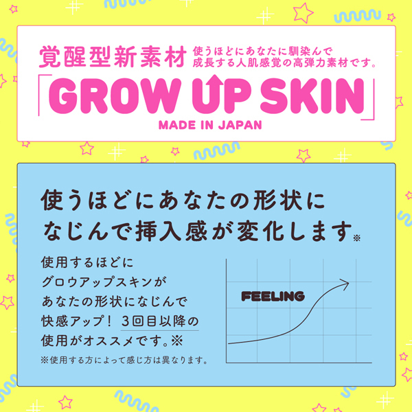高い伸縮性&耐久性を誇る覚醒型新素材「GROW UP SKIN」採用!肉厚300g、ギュっと締め付け絡みつく非貫通オナホ。張り巡らされたヒダと押し合うイボのプレスで極上快感!使えば使うほど肌に馴染み成長する人肌感触の高弾力スキン仕様で、特に3回目以降はより気持ちいい挿入感を味わえます♪パッケージは「すーぱーぞんび」氏◎日本製、収納袋&ローション付属