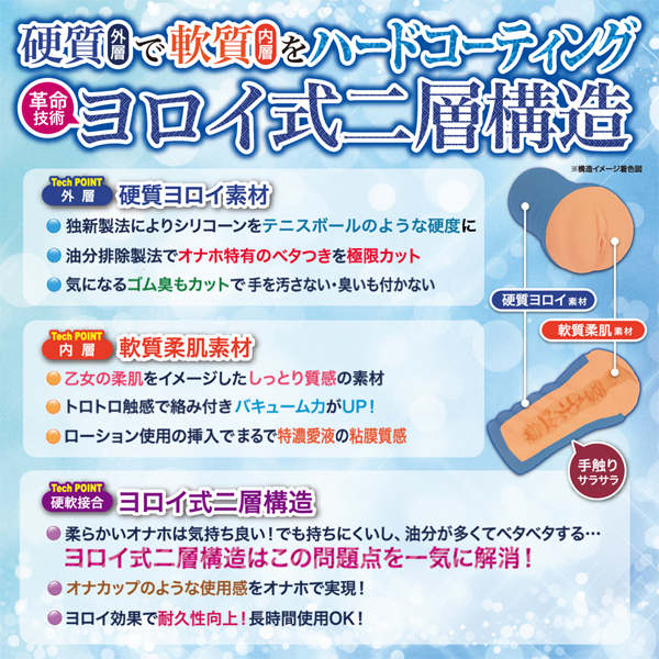 「柔らかいオナホは気持ちいい!でも持ちにくいし油分がベタベタする。」とお嘆きのあなたに、ヨロイ×乙女の柔肌!硬質素材(外層)で軟質素材(内層)をハードコーティング!鎧乙女オトメイルは硬軟素材が接合した革命技術「ヨロイ式二層構造」の非貫通オナホールです。外層は独自技術により、オナホ特有の「ベタつき」や「ゴム臭」を極限カットし、テニスボールのような硬度に生成しました。そして、硬いヨロイに覆われた内層部分は、メリハリのきいた硬度ギャップのトロトロ軟質素材。乙女の柔肌をイメージしたしっとり質感で絡み付き、粘着質なバキューム効果を生み出します。鎧乙女オトメイル ジャンヌ、ダルクは無尽蔵に配置された「ゴシック式イボ構造」がねっとり纏わり付く粘膜質感、べたつき、臭いを排除した硬軟素材接合のヨロイ式二層構造「鎧乙女オトメイル」を是非お試しください。簡単お手軽なオナカップの使用感で、非貫通オナホのバキューム力を得られるオナホールです。