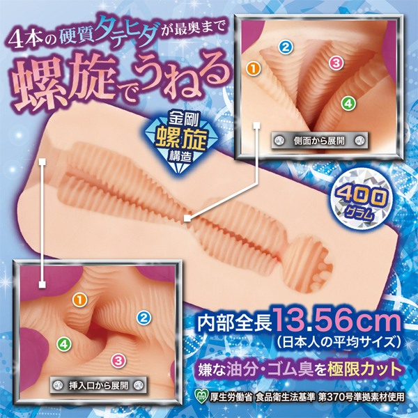 螺旋でせんずり、それがラセンズリー!ダイヤモンドラセンズリーは、4本の硬質タテヒダが「螺旋でうねる」高刺激スパイラルオナホールです。螺旋でうねる硬質タテヒダの正体は「3mm間隔ヨコヒダ」の集合体。この仕様により「タテでの螺旋の刺激」と「ヨコヒダのまとわりつく刺激」が挿入口から連なり「複雑なうねり刺激」が発生。最奥に配置された「突イボ」スポットへの到達で緩急ある快感となり、深みのある使用感のオナホールとなっています。ボディは「螺旋の刺激をMAX」で伝えるために「オクタゴン(八角形)造形」を採用。8つのエッジが内部の4本の硬質タテヒダをピンポイントで押しつけ、螺旋の快感を逃しません。全長150mmのミドルタイプですので、ストロークの時に「先端がしな垂れる」ことなく、真っ直ぐなフォルムをキープ。ストレートな螺旋の刺激を余すことなくお楽しみいただけます。保管に便利な専用ブリスターケース、オリジナルローション付属。非貫通のオナホール