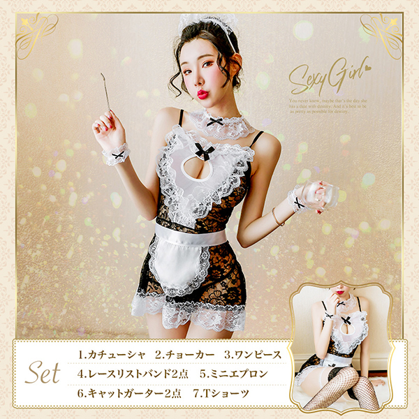 フリーサイズ セット内容:カチューシャ、チョーカー、ワンピース、レースリストバンド×2、ミニエプロン、キャットガーター、Tバックショーツ