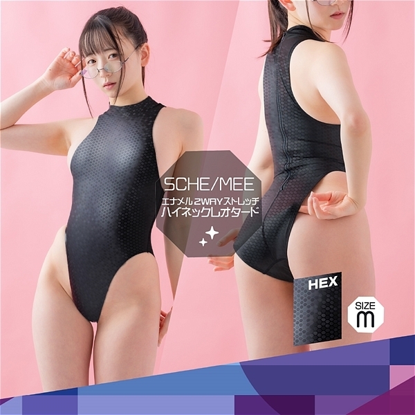 様々な素材感の黒い2WAYエナメルストレッチ素材を使用したハイネックレオタードのセクシーなコスチュームです。幾何学模様がまるでスパンコールのように輝くHEX柄はとってもカッコよくてクールな素材です。Mサイズ
