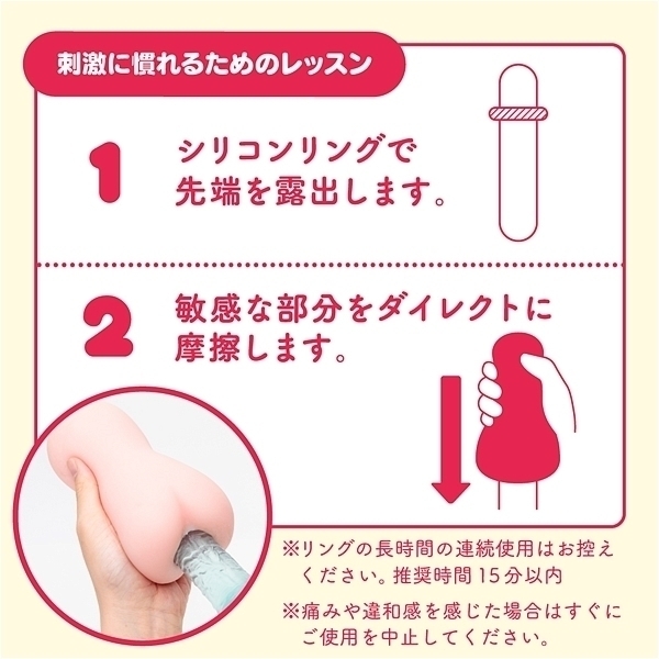 『早くイッちゃダメ!』刺激ほぼゼロ!超絶まったり系!やわらか、とろ〜り生オナホ!あなたの先端をちゅるんと飲み込むプリプリポルチオ搭載!とぅるんとぅるん快感のチュポチュポとろけるレッスン!付属のシリコンリングで敏感部分を露出し先端強化!ぷにっとソフトなリングで優しい締め付けを可能にしています。大中小の3種類でいろんなサイズにぴったりフィットします。敏感部分をふんわりとろける生感触で低刺激。レッスンしながら楽しめる一石二鳥のホールです。直接肌に触れるものだから安心の国産素材&国内生産。パッケージイラスト:平つくね