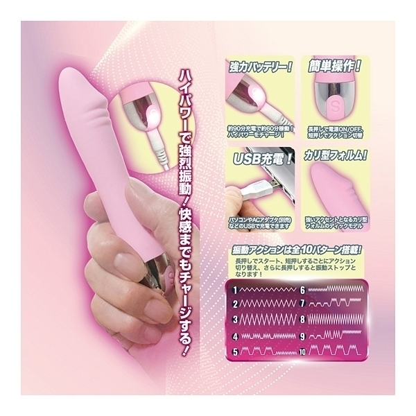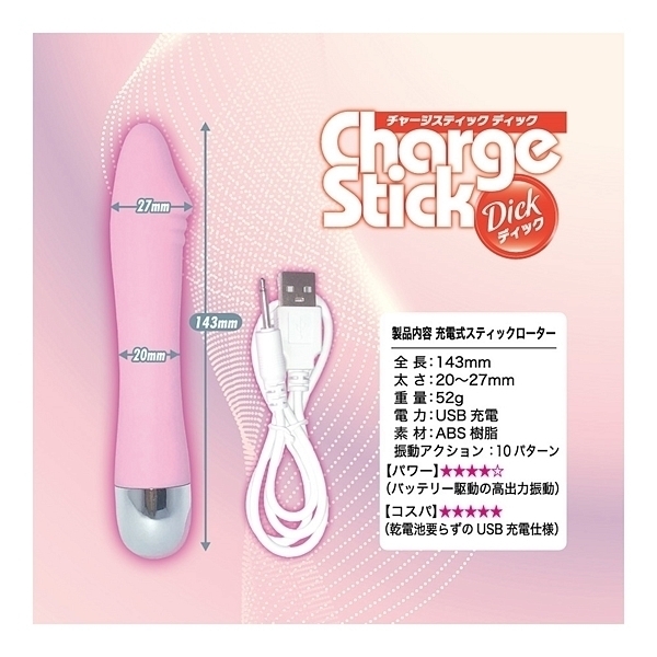 ハイパワー振動!コスパ最強!チャージ(充電)タイプのスティックトイが新登場!全長14センチとなる手のひらサイズの充電式スティックローターです。乾電池要らずの充電バッテリー仕様なので、乾電池では実現できない高出力の強烈振動が楽しめます!さらに、振動アクションは全10パターン搭載。ボタンを押すごとにアクションが切り替わりますので、お好みの振動アクションを見付けましょう!さらに、チャージ方法はUSB方式なので、モバイルバッテリーやPCなど様々な環境で充電可能。乾電池要らずなのでコスパも抜群です。初めての方にもオススメできる、小ぶりサイズの太さ27ミリ。軽くて持ちやすい、重さ52グラム。すべすべと肌ざわり良い、マット表面加工。充電時間90分で、約60分間の連続稼働します。「ディック」モデルは、先端に亀●が付いたメンズ型フォルム。返し形状デザインで独特の刺激を楽しめます。パワーもエネルギーも快感もチャージする、最新鋭のスティックローター!