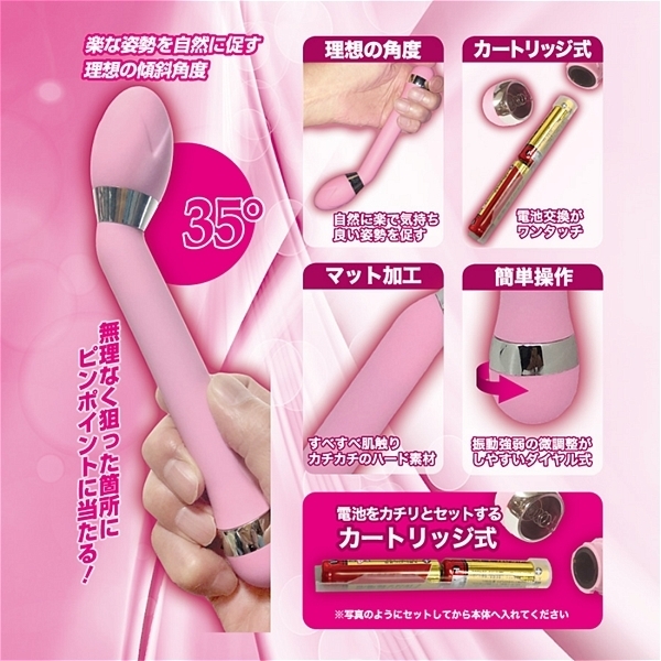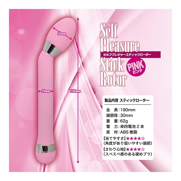 この角度が凄い!セルフプレジャーにピッタリ!おじぎをするように頭部が曲がったタイプのスティックトイが新登場!全長19センチのセルフプレジャー向けのスティックローター。傾斜度35度、狙った箇所に当てやすいように頭部の角度を曲げました。この傾斜度が、無理な体勢を強いらずに、自然に楽で気持ち良い姿勢へ促すことでしょう!さらに、振動を強弱調整しやすいダイヤル式コントローラー。電池をセットしやすい、カートリッジ式。使いやすいサイズとなる、全長19センチに、頭部直径3cm。握りやすい、スティック部直径2センチ。軽くて持ちやすい、重さ62グラム。すべすべと肌ざわり良い、マット表面加工。貴方自身をもっと輝かせる、セルフなプレジャーを応援するスティックローター!●カラー:ピンク