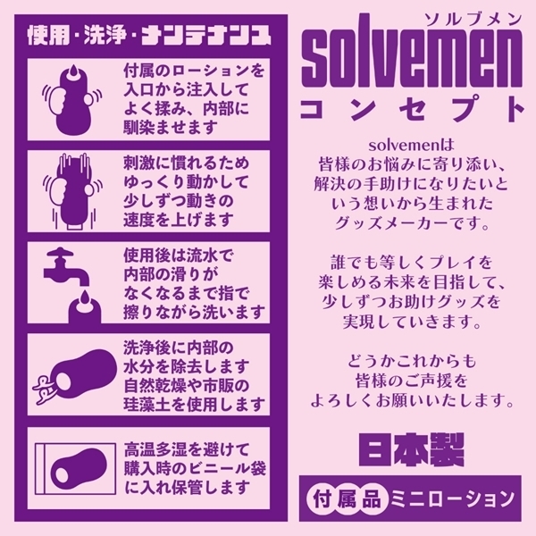 ソルブメンはあなたのお悩みを解決する存在です。「同じ構造でも素材が違えばそこは別世界」「優しくねっとりかきわけたい」同じものを使い続けたいときもあれば、1日おきに違うものを使いたいときもある。そんな気まぐれに全力で応えたいです。それがソルブメンの生まれた意味だと思いませんか?今回のテーマは「優しくねっとりかきわけたい」となります。今日は時間もあるしまったりしたい時に今回のテーマの「優しくねっとりかきわけたい」最適!それは間違いないのです。あなたはオナホ選びに悩む必要はなくなります。あなたのためにソルブメンがいるのです。安心安全の日本製で繰り返し何度でも利用が可能です。