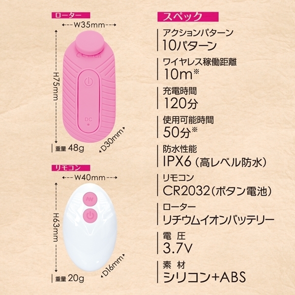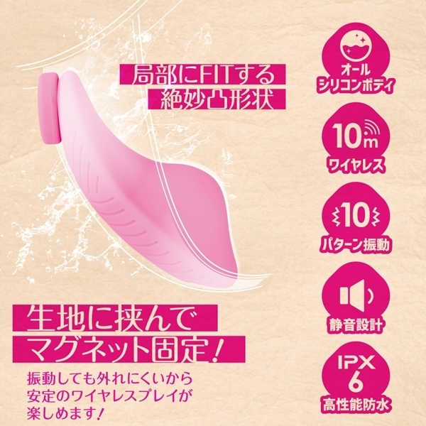 マグネットで挟んでピッタリFITする静音ワイヤレスローター。ズレにくくピンポイントで好きな所でローターを固定出来るのでより集中してプレイを楽しめます。肌触りが滑らかな高品質シリコン素材採用。ワイヤレス稼働距離10M、120分の充電で最大50分使用可能、ローター部分はIPX6の高レベル防水なのでしっかり洗えて衛生的にも安心してお使い頂けます。※使用環境により電池の減りは大幅に増減します●ピンク