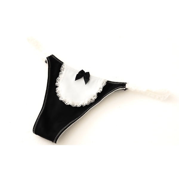 日本国内の工場で縫製された、伸縮性のある肌触りの良いマイクロファイバー生地を使ったメイドスタイルのTバックショーツです。小さなリボンとエプロンやレースをあつらえた、キュートでセクシーなメイド風デザインのショーツです。