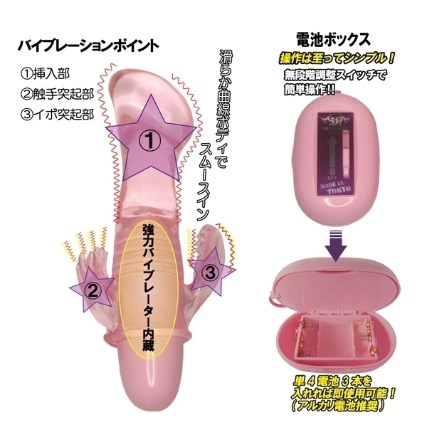 3つのポイントを集中的に刺激する快感増幅バイブ!ヘッドの形状は滑らかな曲線で楽々スムースイン、敏感G●ポットを大胆刺激!下部にあるイボ突起は柔らかく、伝わるバイブレーションでク●への刺激に歓喜!!反対側にある触手突起はまるでブラシの様。バイブの刺激でク●でもア●ルでも快感●大間違いなし!扱いやすいコンパクトサイズ!無段階調整のリモコンでスムーズ操作抜群!☆単四電池3本入り☆安全・安心の日本製!