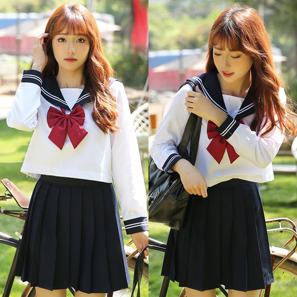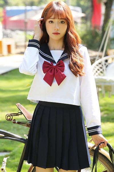 清潔感溢れる紺と白の制服を、真っ赤な大きいスクールリボンで華やかに魅せた長袖仕様のセーラー服。2本の白ラインを施したトップスと、紺のプリーツスカート、リボンがついた3点セット◎Mサイズ※色落ちの可能性がありますので洗濯の際は単品手洗いでお願いします。※こちらの商品は受注発注商品の為、ご注文から発送までに3、4営業日掛かる場合が御座います。