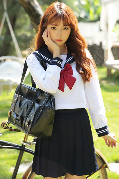 > <malymoon>紺×白色の赤リボン長袖セーラー服