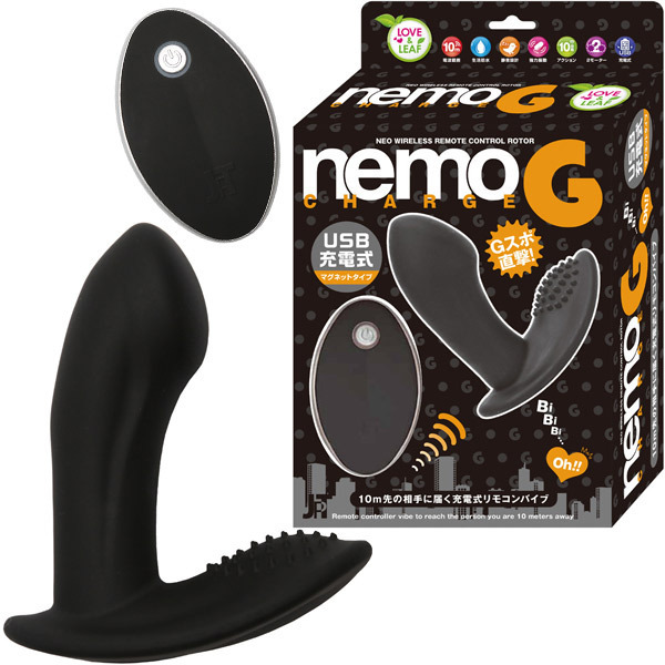 遠隔操作で楽しむ大人気のリモコングッズ「nemo」シリーズに、Gスポット直撃型リモコンバイブ「nemoG ブラック」が登場。●肌触りの良いすべすべマット加工●手の中に納まるリーフ型リモコン●シャフトと土台にモーターをW搭載●10パターンのハイパワー振動装備●よりパワフルな振動かつ静音性UP●遠隔操作可能な最大距離は約10m●ワンボタンでON/OFF・振動切替可●便利なマグネットUSB充電に対応●フル充電約2時間で約3.5時間稼動●充電コード、リモコン用電池付属●丸洗い可能な生活防水仕様(振動部のみ)。アナルにも使える万能フォルム♪ダブルモーターのハイパワー振動が10m先まで届く、ネモシリーズのGスポットバイブ。リモコン用電池の絶縁体を取り外してからご使用ください。また、受信機は電波受信の為に振動時以外も電池を消費しますので、使用後は必ず電源をOFFにしてください。